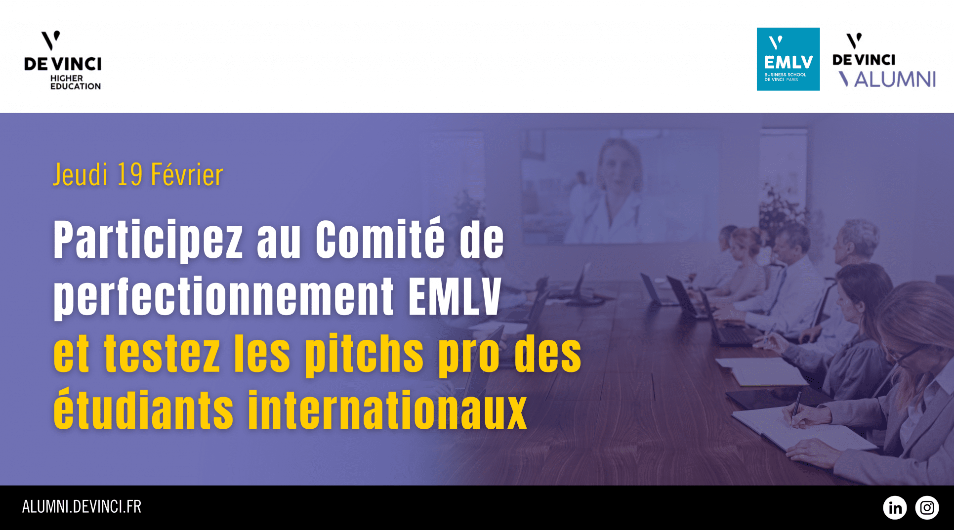 EMLV MSc & MBA students will have the opportunity to present their professional pitch and application pitch (in English). This is a great opportunity for them to receive your expert advice and constructive feedback! Sign up to be part of the jury!